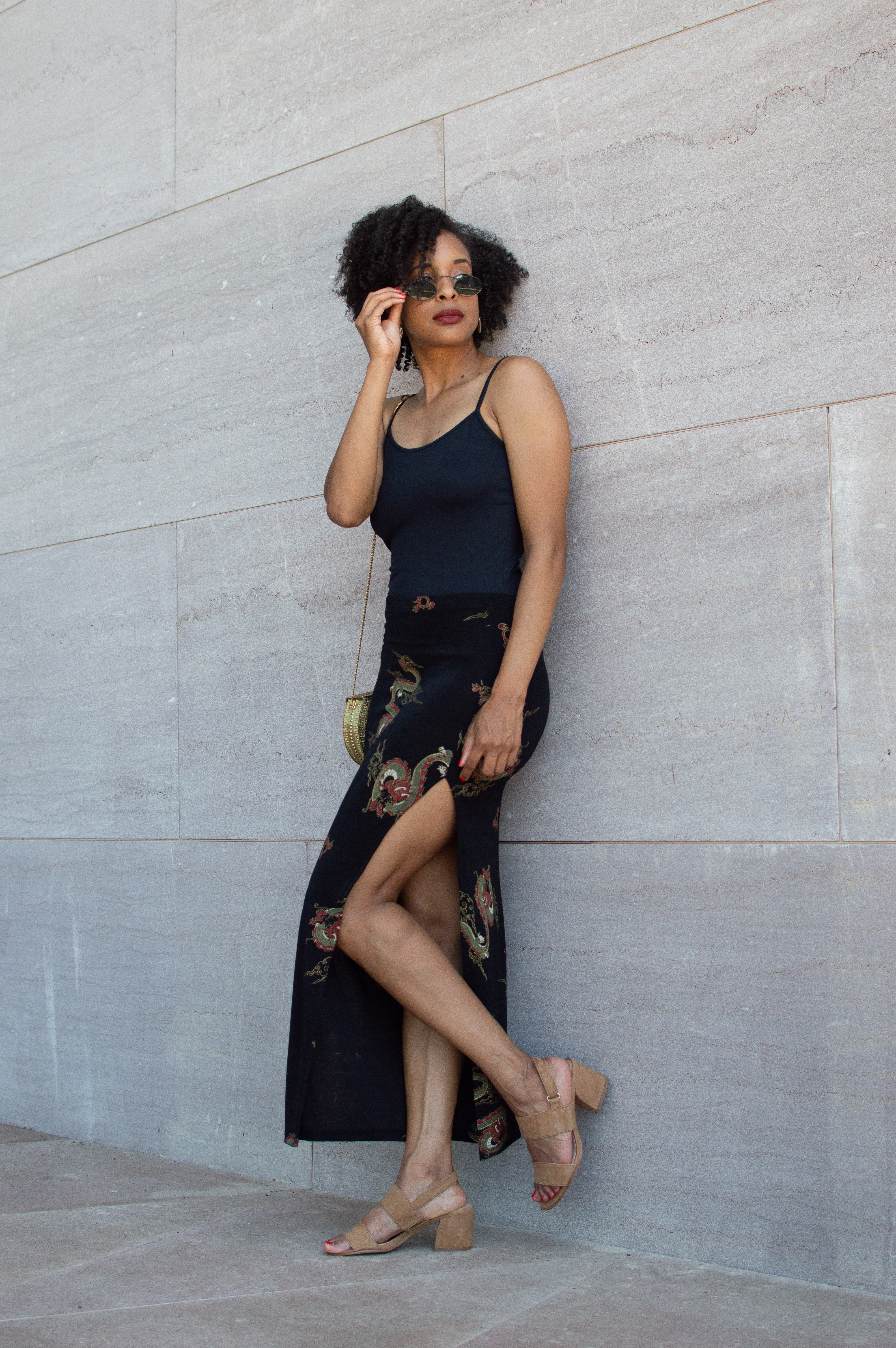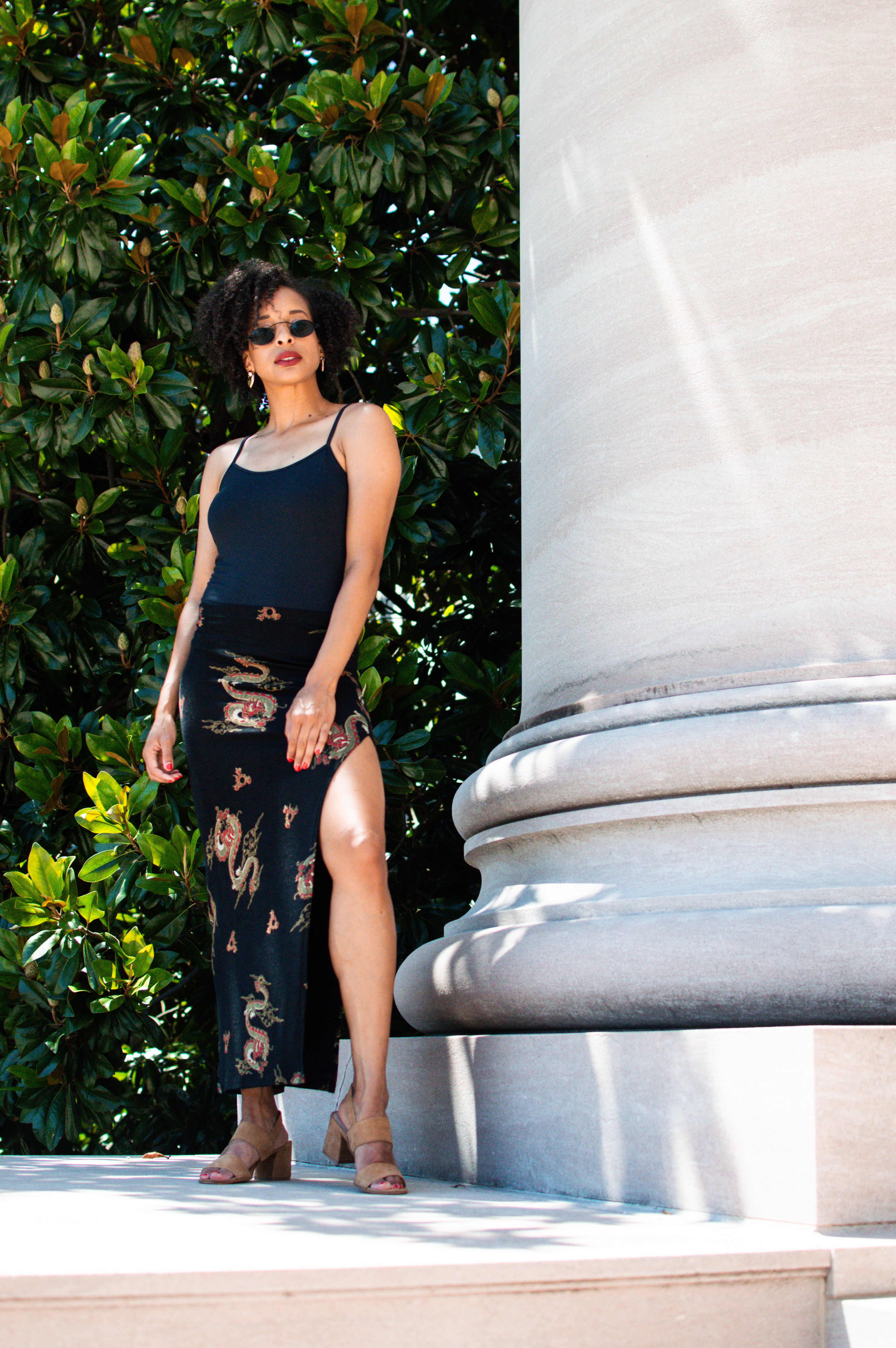 The first look is m favorite! The skirt has a Japanese Dragon (also known as Tatsu) print with a high split up the side. I paired this staple piece with a simple black tank top and a neutral heel to break the color.