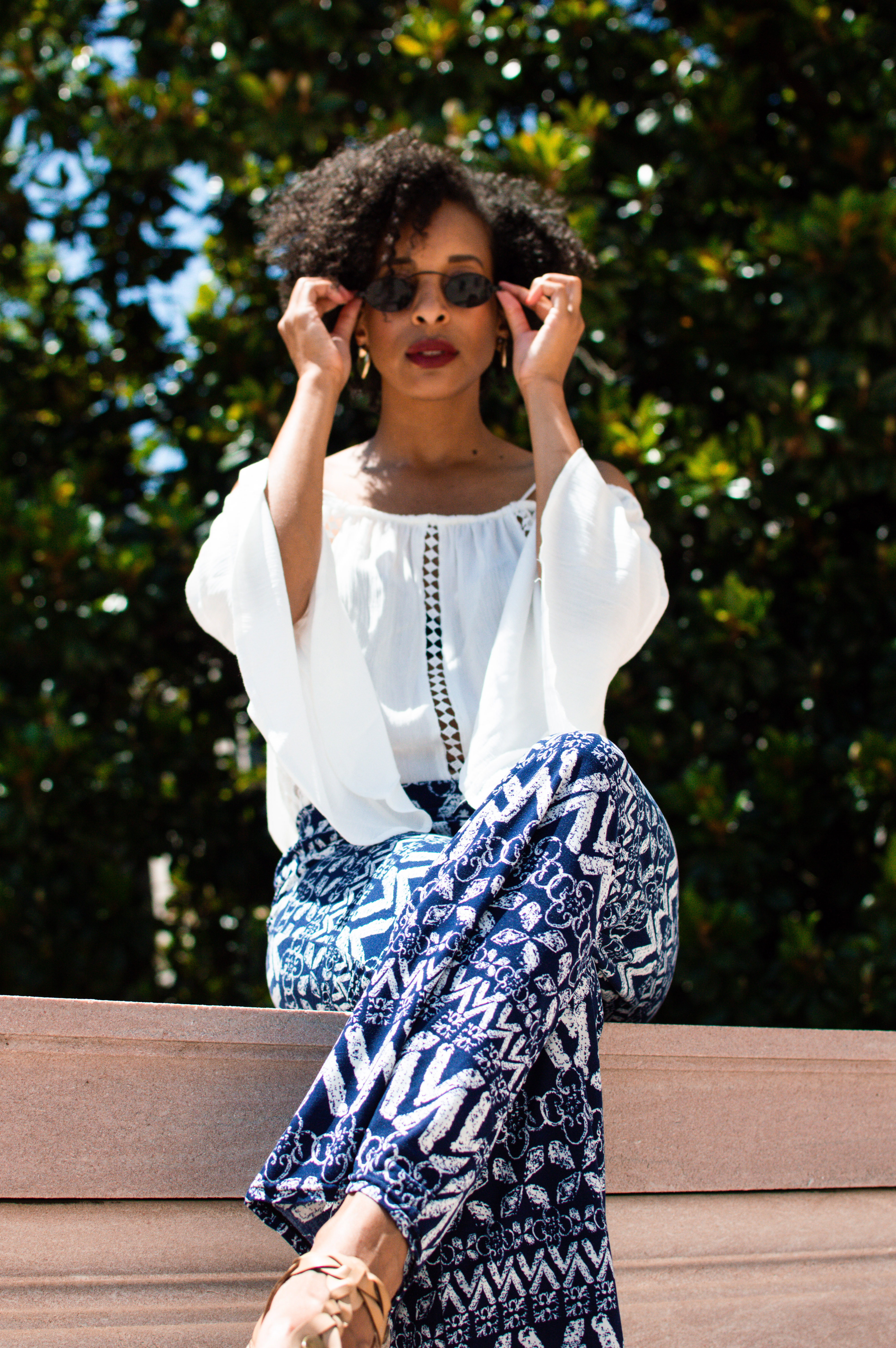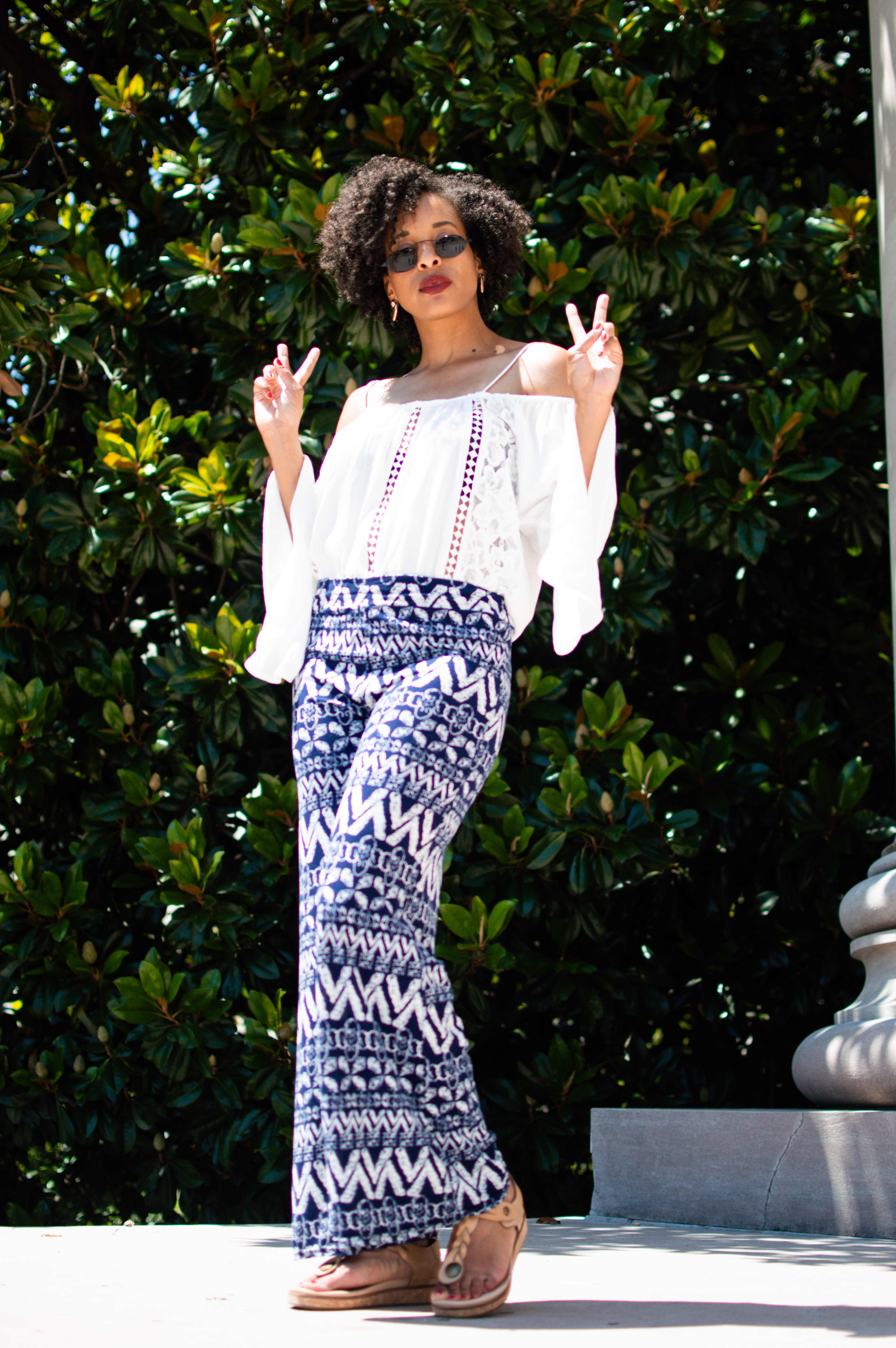 Love, Peace, Soul is the mood for this final look. I pulled off this 70s theme outfit with a sheer white off the shoulder blouse, navy blue and white bell-bottoms pants and neutral flat sandals.