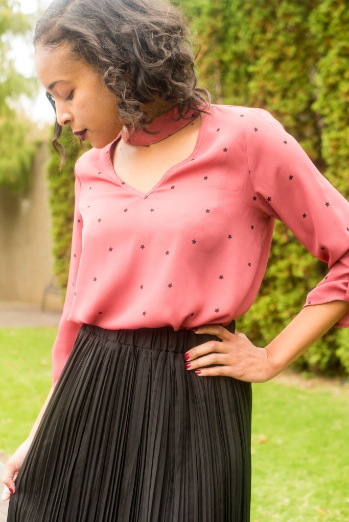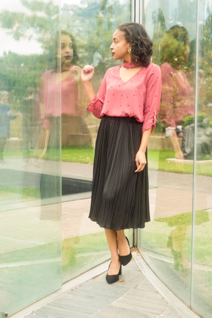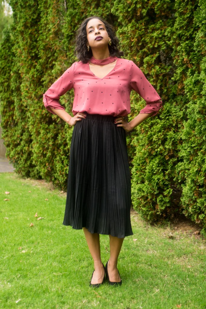 It’s that the time of the year, where you are spending more time at your job’s annual holiday office party, breakfast or luncheon than you are at your desk. Today, I attended a holiday breakfast and wore a lovely pink v-shaped blouse with a black calf-length pleated skirt. This outfit was fun, stylish, and appropriate for the office.