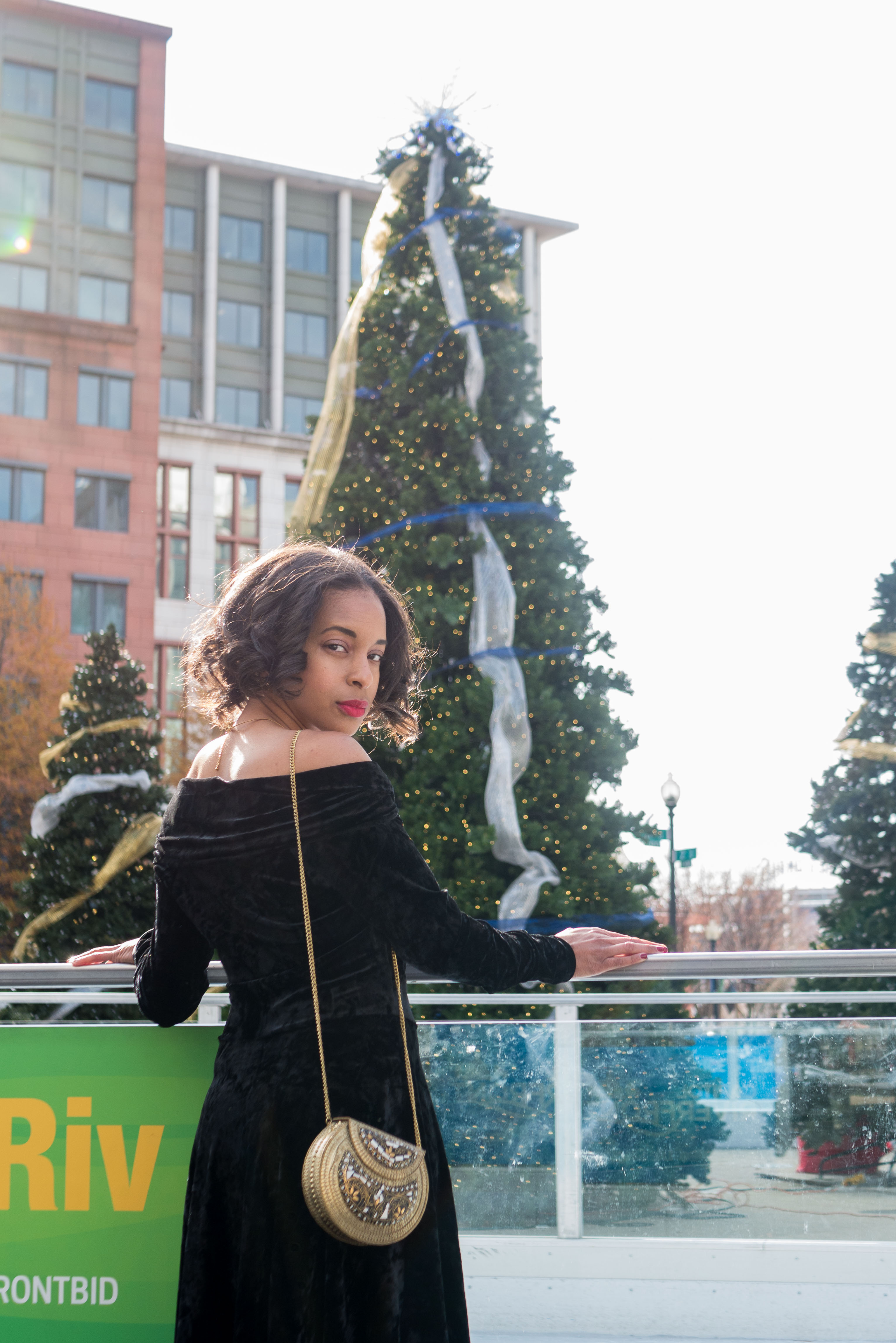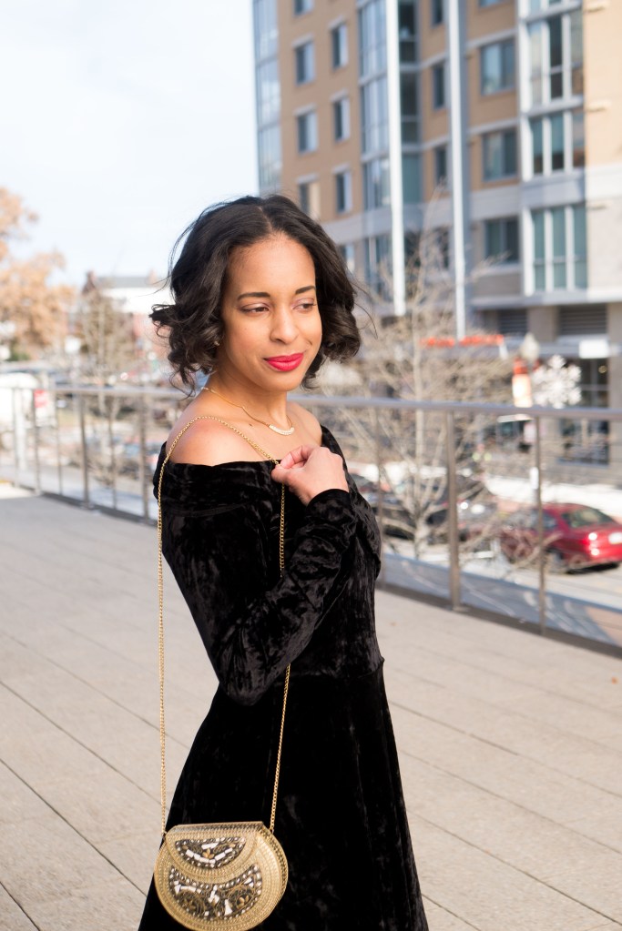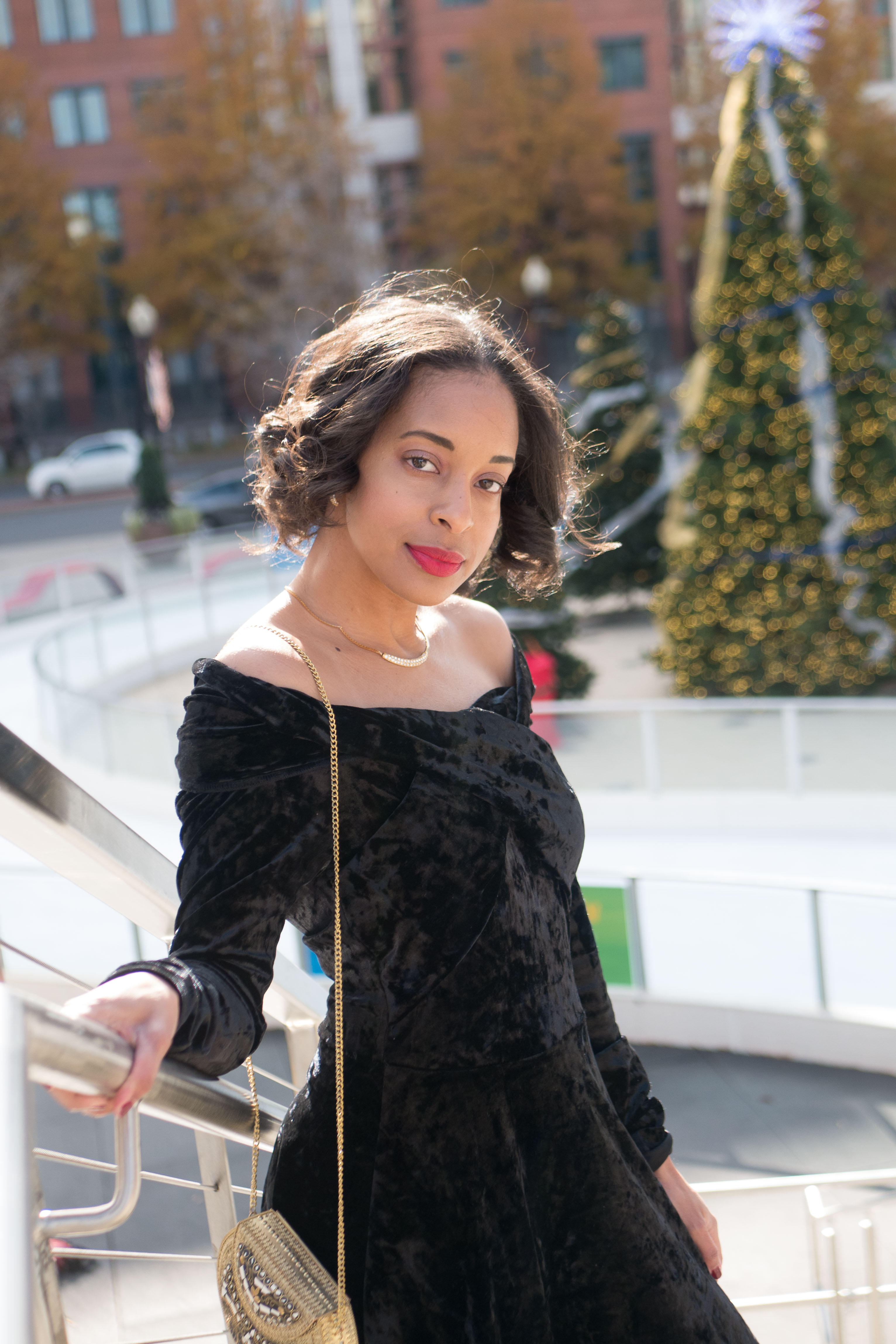 Every year on Christmas Eve, I love getting dressed up for my annual family dinner. So, when I found a black off-the-shoulder velvet dress at the Thrift Store, I was Ecstatic! This dress is a perfect holiday staple that screams “festive and Chic.”