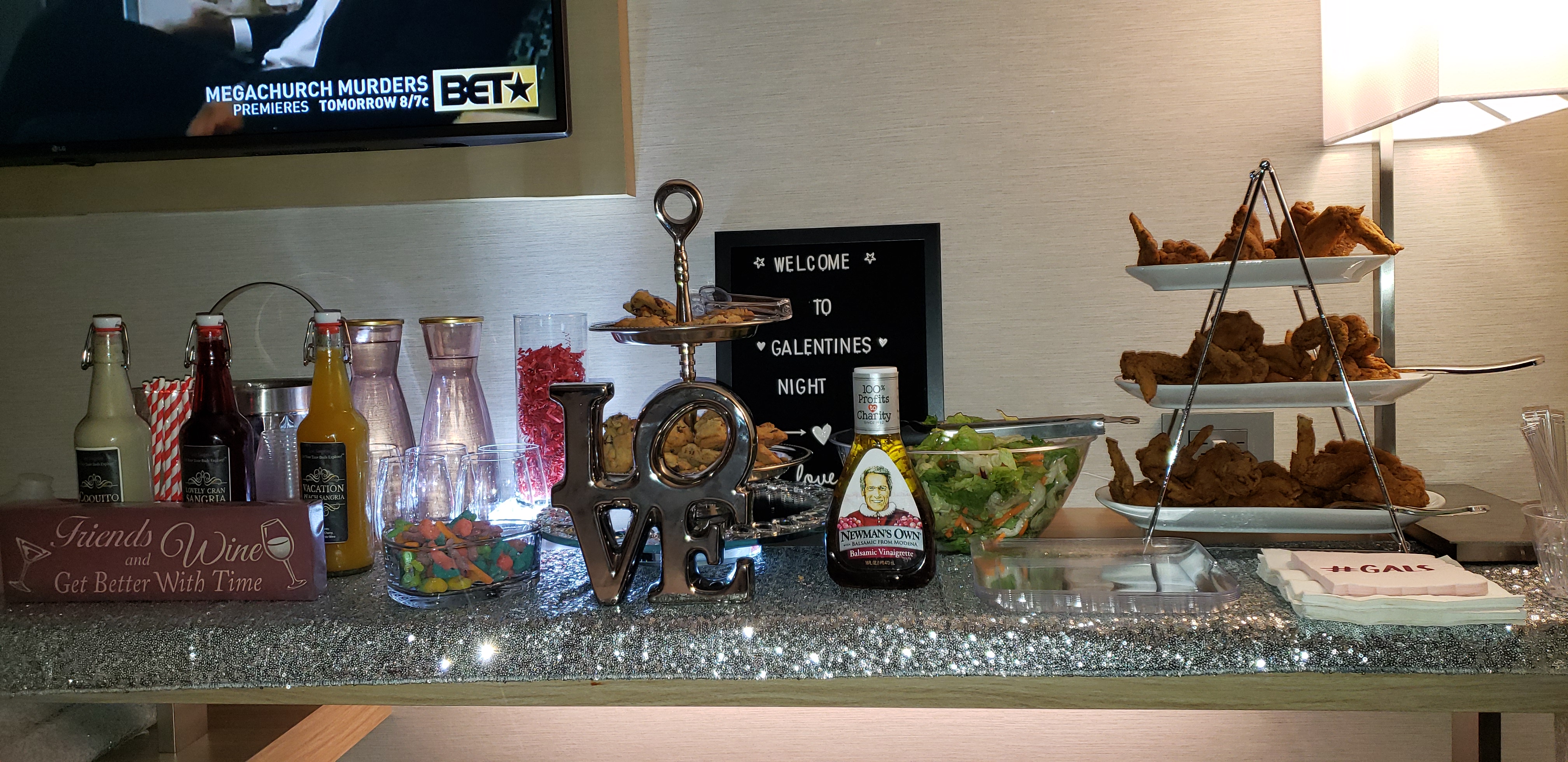 I hosted my first annual Galentine’s Day Slumber Party a couple of weeks ago for four of my girlfriends. The theme for this year’s festivities was “Self Care.” I wanted to convey how important it is to take time out for yourself. I partnered with Shanny B’s interior design to create a safe place for girlfriends to come together to eat, drink, play games, and talk shit. We enjoyed custom handcrafted sangrias by Lexi Sangria, Fried Chicken, salad, and freshly-baked cookies. Each individual received a gift bag with Self Care essentials such as Pacifica Kale Detox Deep Cleaning Face Wash, Hand in Hand Sugar Scrub, and Holler and Glow Facial Mask.