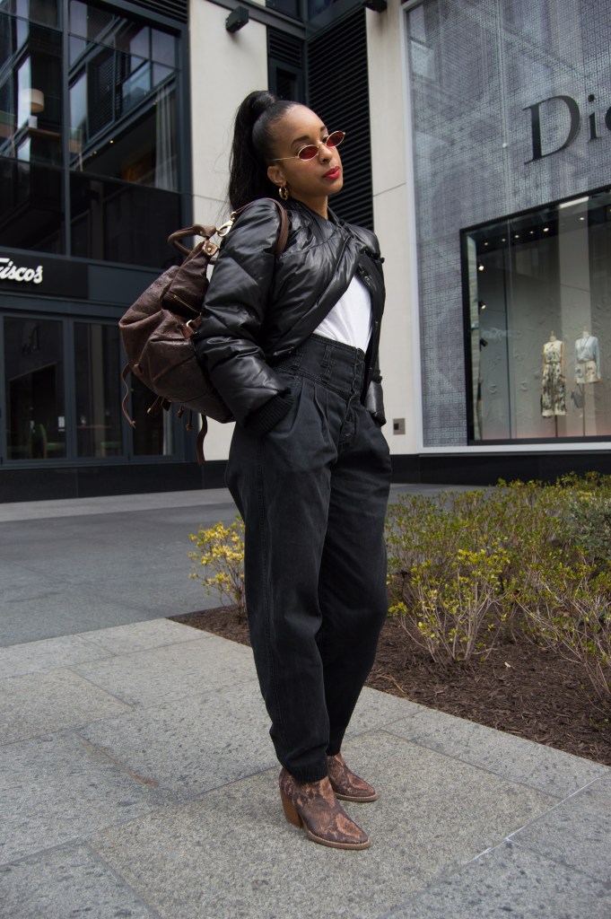 On my way to Brunch a couple of weeks ago, I paid homage to the Around the Way Girl, while adding a skylar flare to it. I wore a BCBG puffer jacket with a plain white blouse and black vintage high waisted jeans. I took it a step further by wearing tiny red-tinted shades, bookbag purse, and wore my hair in a high ponytail to complete the look.
