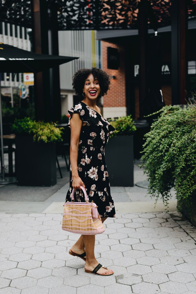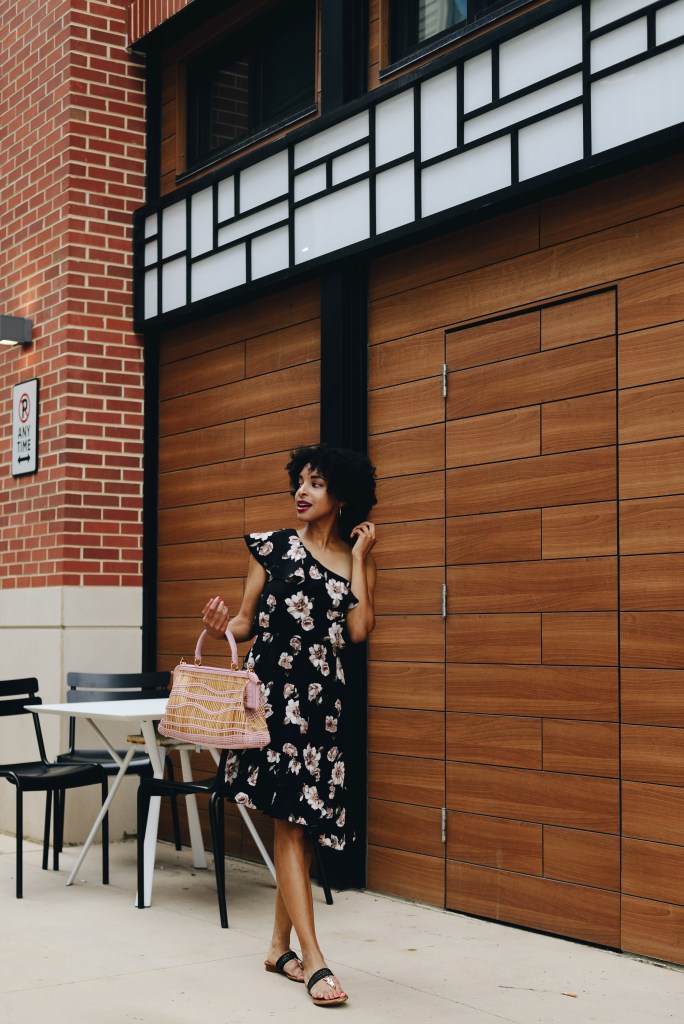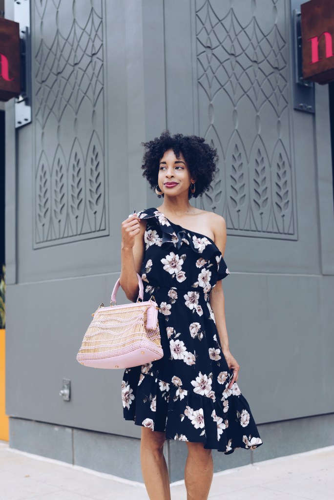 On my way to Brunch, I wore a floral pattern one shoulder ruffle dress that has an asymmetrical hem with a big pink leather and straw tote purse. This is the perfect outfit to catch-up with your BFF in as you guys enjoy a pitcher of sangria.