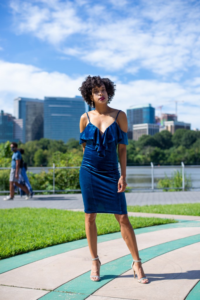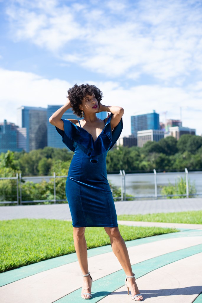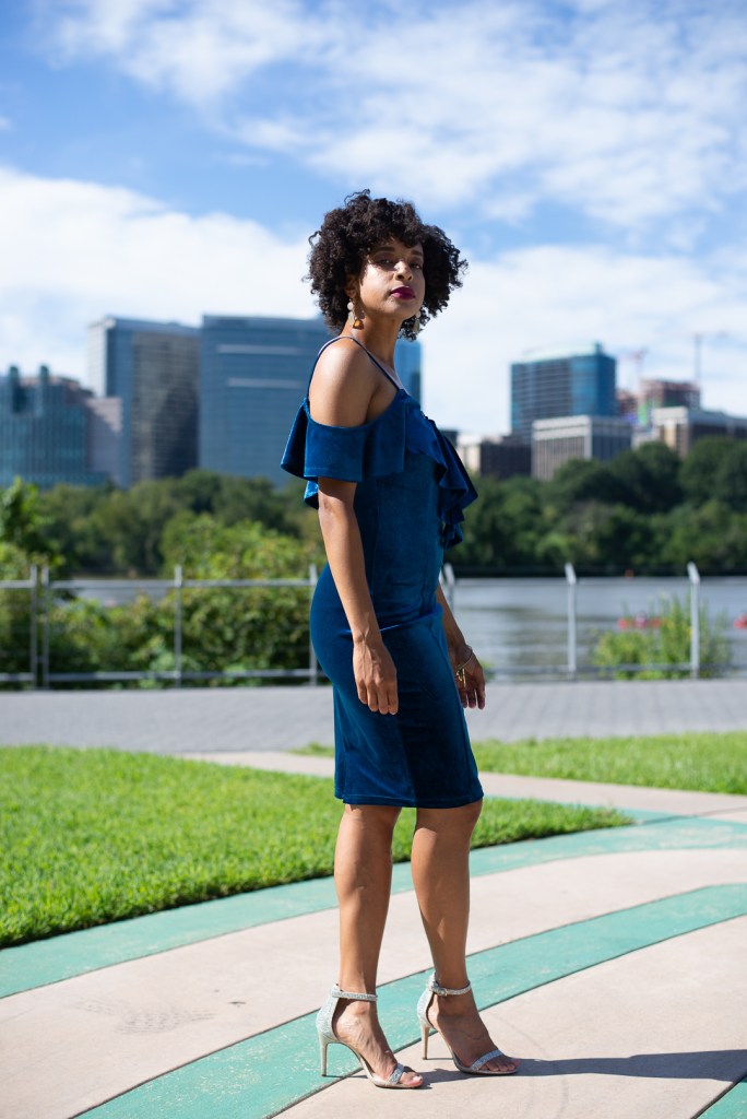 Fall weddings are beautiful. Its the in-between weather that allows you to wear darker colors and explore new fabrics while holding on to your open-toe shoes. During quarantine, I found a chic velvet navy blue cocktail dress on Thred-Up – a popular online thrift store. I wore a simple sandal heel to complete this look . I may not have a wedding to attend this season, But I do have a dress to wear in Fall 2021!