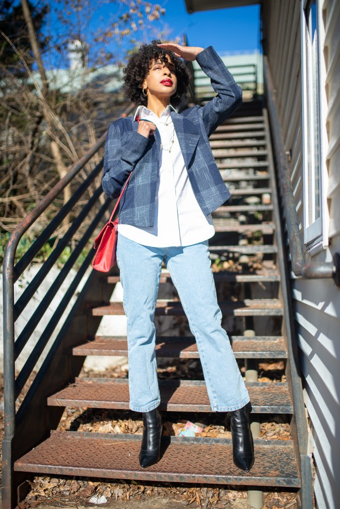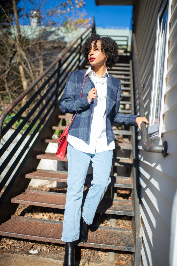 There’s not much to do now and days due to restrictions. So when I want to meet up with friends, we find a restaurant with outdoor dining. January has been very mild, so I was able to feel comfortable under heated lamps in a casual Tahari ASL blazer paired with a white-collar blouse and an Old Navy high-waisted blue denim cut-off ankle jeans. I wore a red purse with this outfit to add a pop of color.