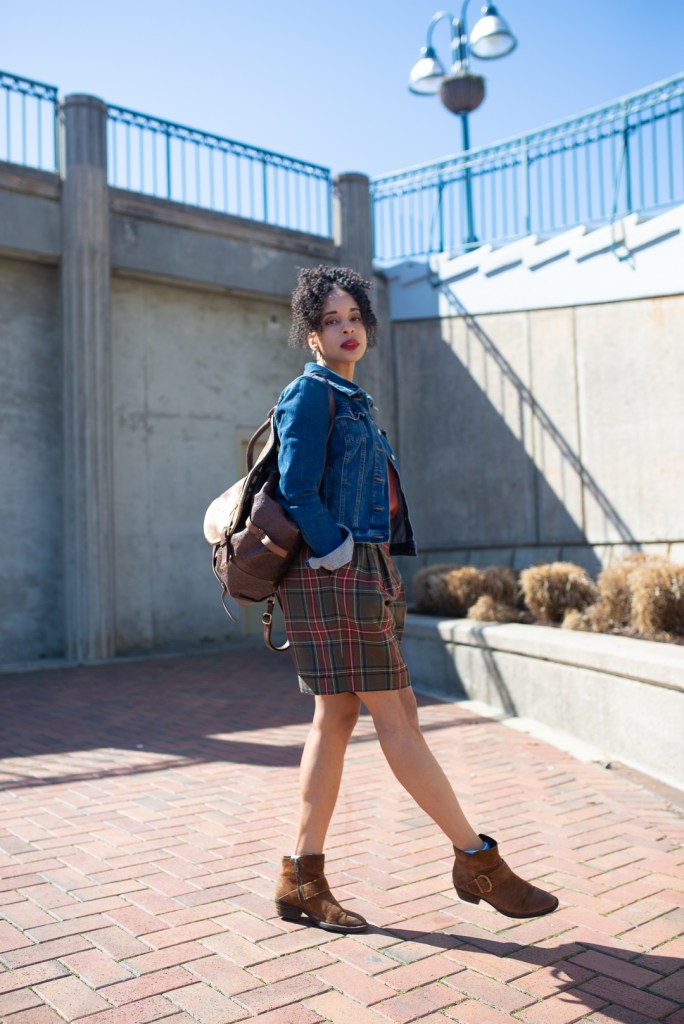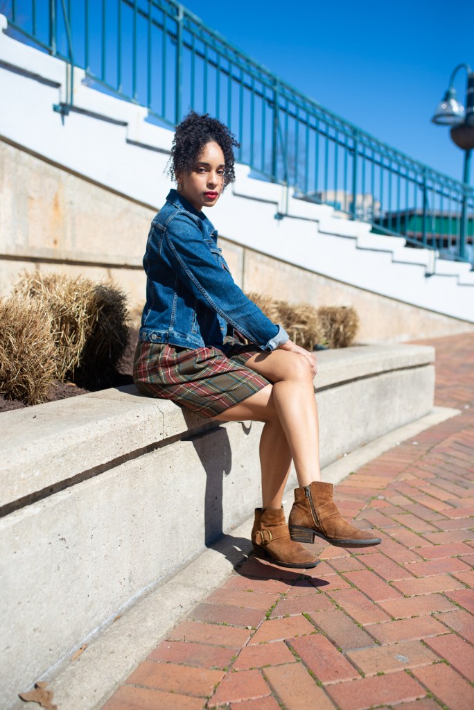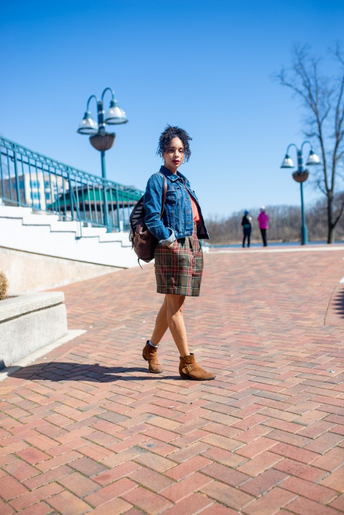 Transitioning from winter to spring can be a little tricky because I cannot fully transition my closet to my spring/summer outfits due to the weather fluctuating from 62 to 75 degrees. It’s still on the cool side of spring, which means it is not time to start placing my spring/summer clothes into my closet. I always go through this dilemma this time of the year, which is why I invested in a couple of transitional outfits to help get me through this unpredictable weather. One of my go-to outfits for this seasonal transition is a checked Bermuda short, with a pinkish-red blouse, denim jean jacket, and tan booties. Based on how cold it is, I can opt-in or out of wearing nude stockings.