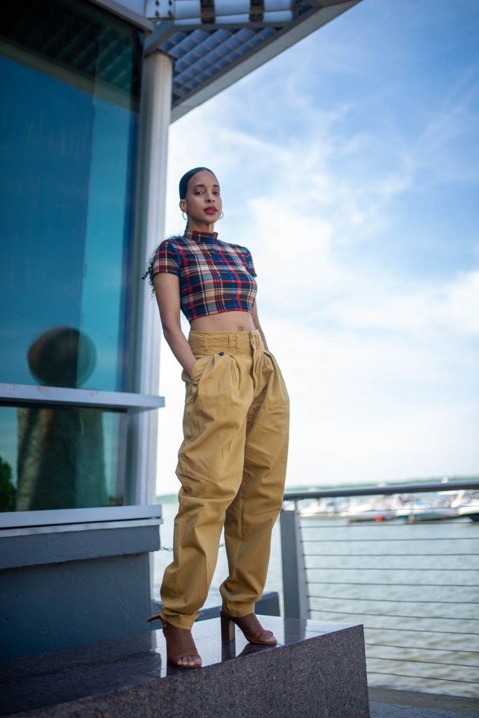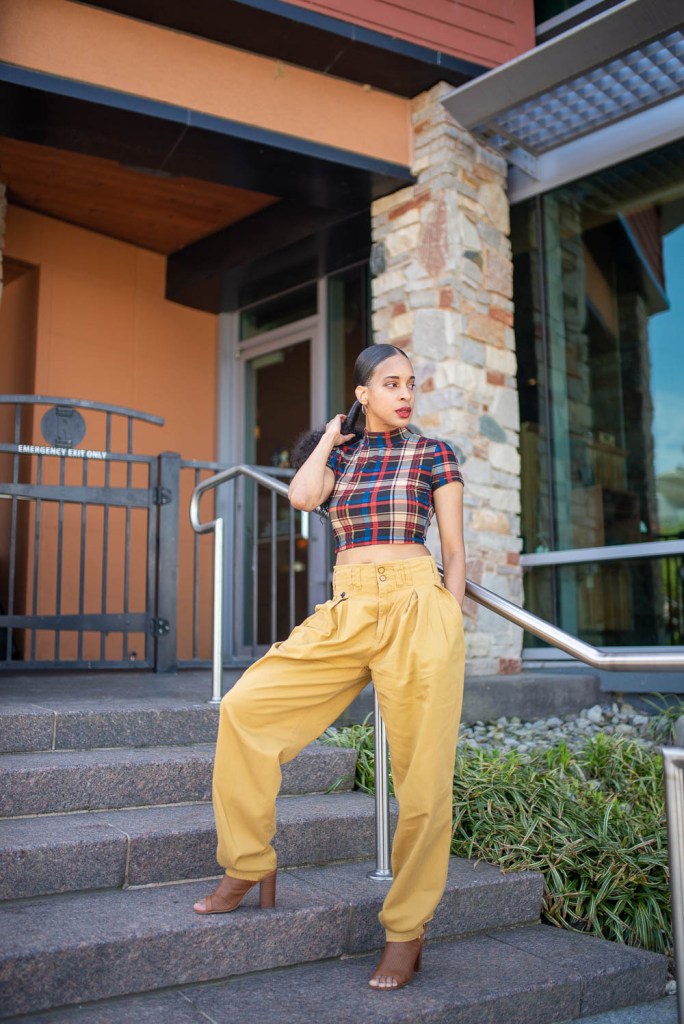 On Friday, we celebrated an 80’s baby birthday. While the rest of us were trying to find loopholes in hanging out during the pandemic, this 80’s baby has safely been quarantining with her family all year long. So when she said that she wanted to have a Birthday dinner, none of us hesitated to come out to celebrate her born day. In honor of this great 80’s baby prodigy’s Birthday, I wore baggy yellow high-waisted harem pants with a multicolor mock-neck crop top and block heels and added a red purse to finish the look.