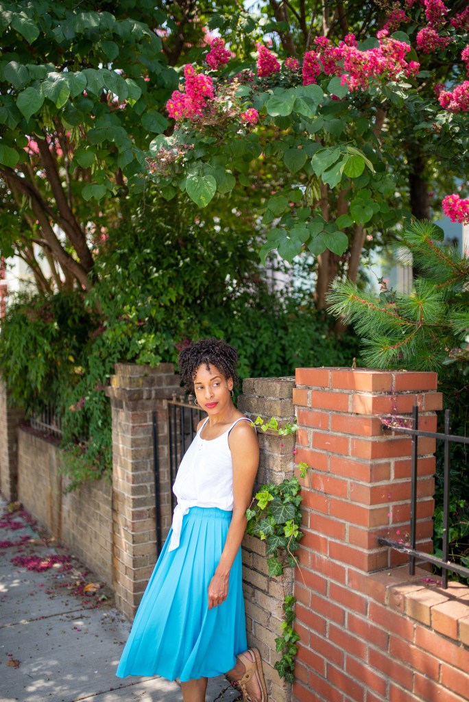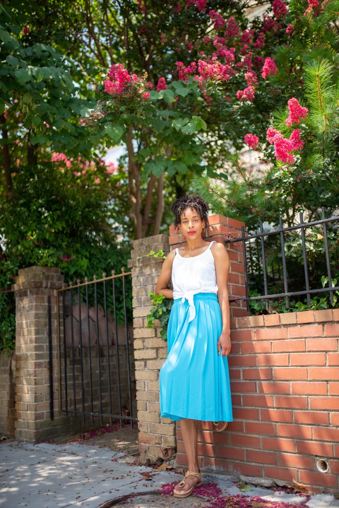 Sometimes after church, I like to link up with my friends for brunch, so finding a suitable transition attire for both church and brunch can be tricky. Although I want to look appropriate for church, I don’t want to look too conservative for brunch afterward. This long light blue pleated skirt with a simple white tie-hem tank top was perfect for both occasions on a Sunday afternoon.
