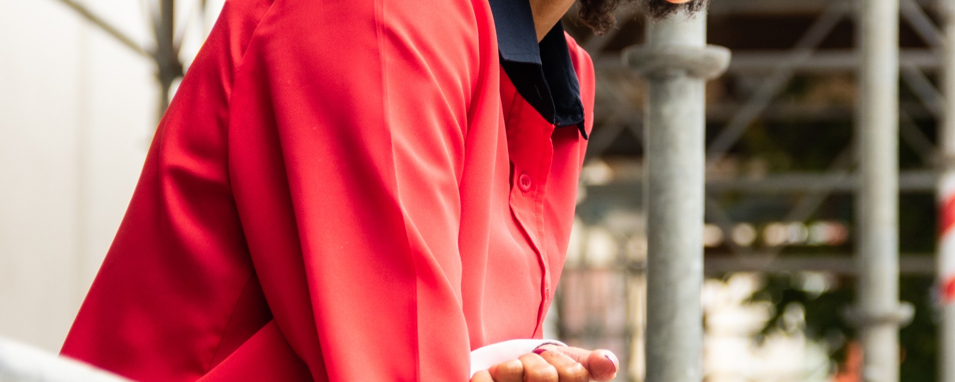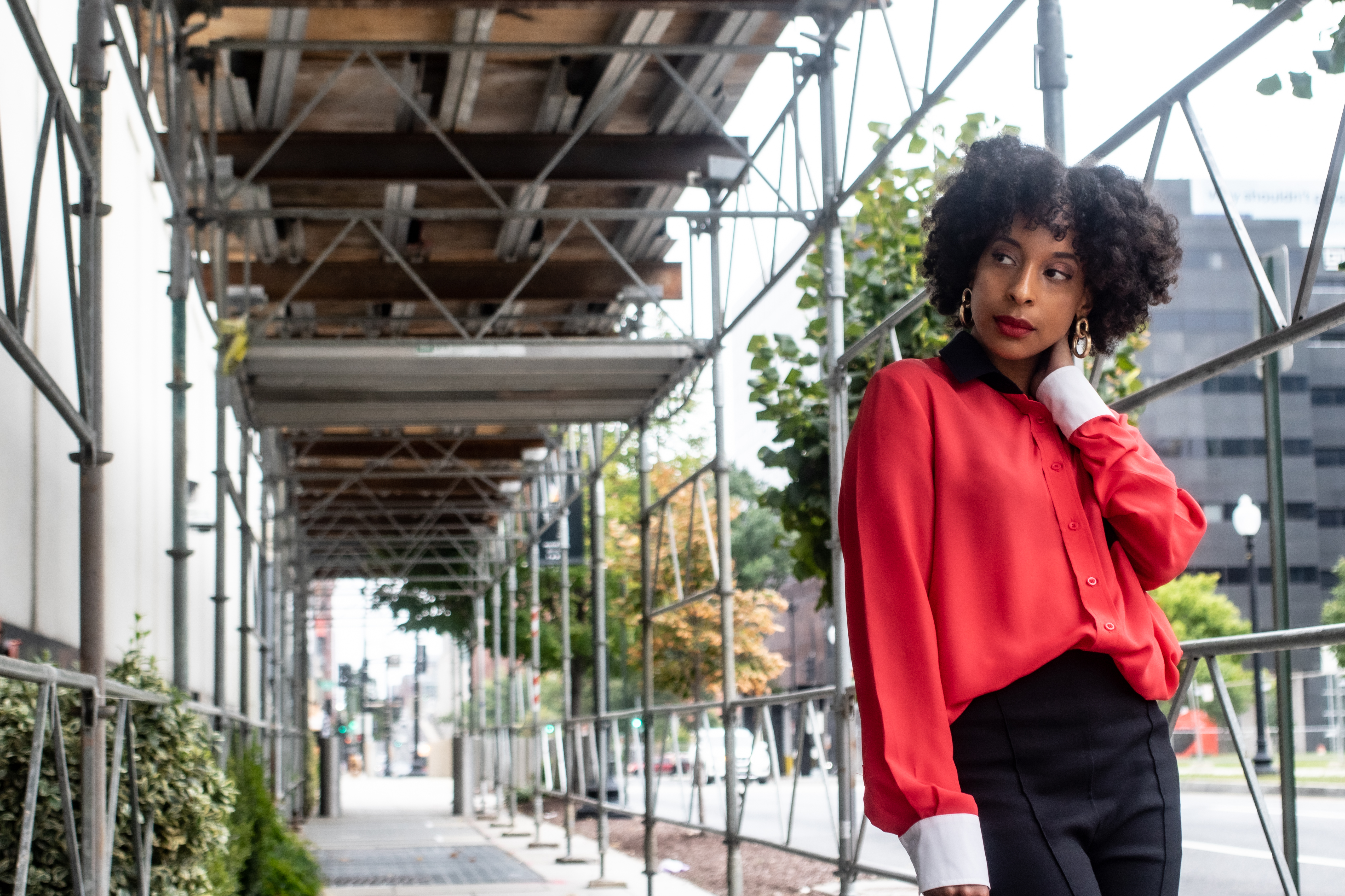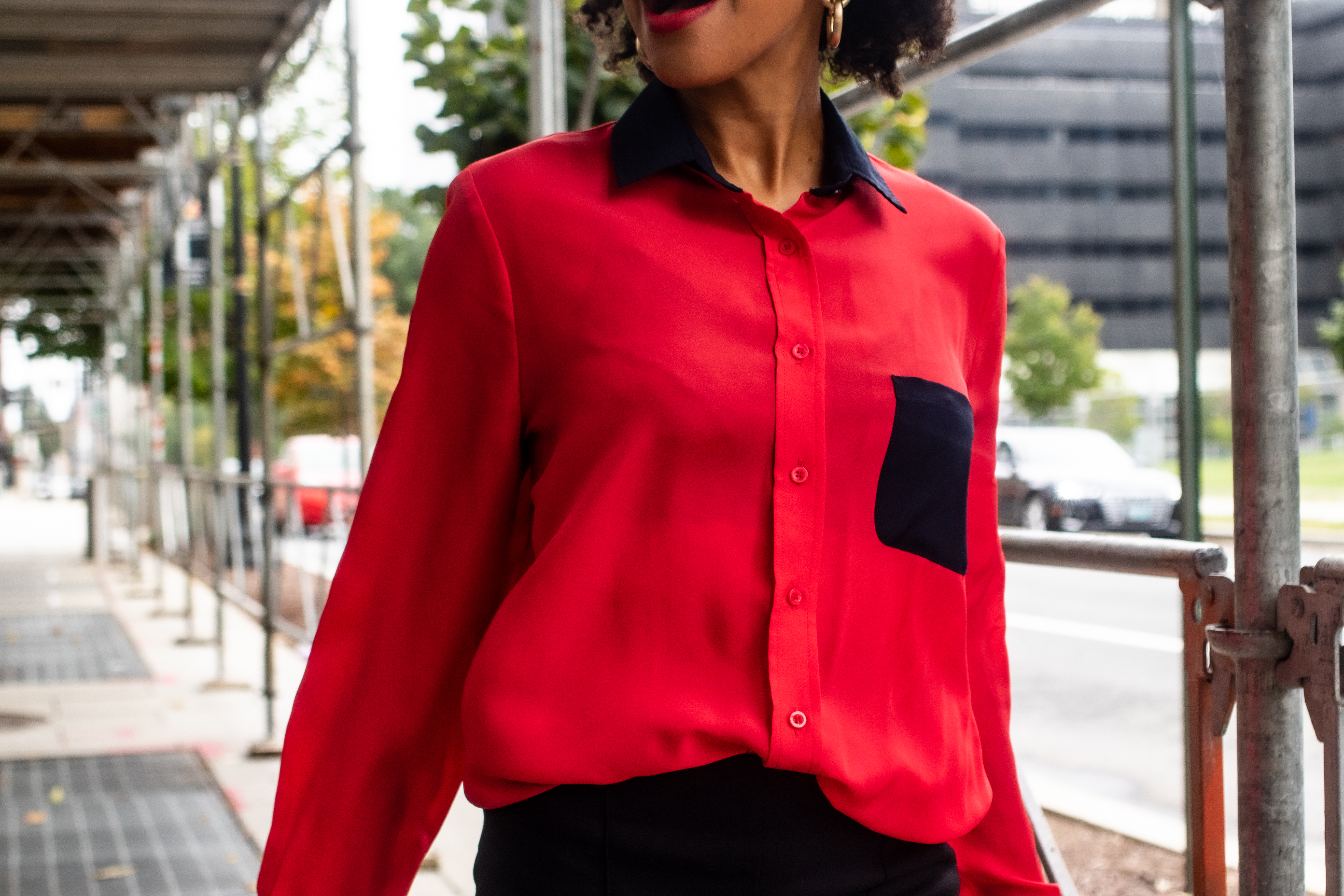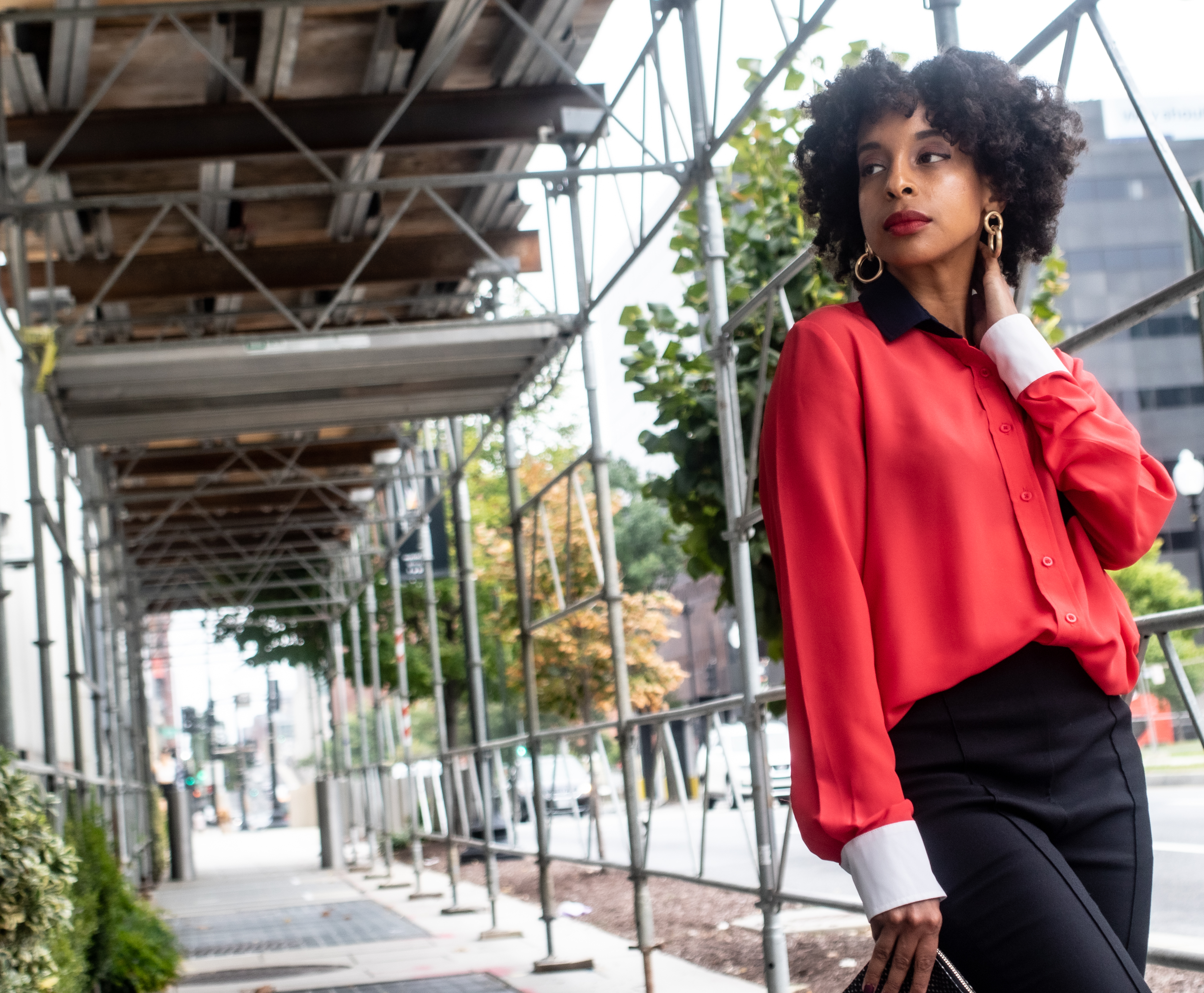 Sometimes a spark of color is what you need to brighten up the corporate atmosphere. It also gives your co-workers a glimpse of your personality. I learned in Marketing that color has meaning, and many companies use it to evoke a feeling in their customers. It’s the same way in fashion; this multi-color silk blouse with a white collar and cuffs and a navy-blue pocket from goodwill was my corporate statement. The red represented strength and determination; the navy blue represented power and authority; white implied fairness and independence. I paired this blouse with skinny black pants, loafers, and a clutch. The outfit was so simple, but yet a necessary corporate statement.