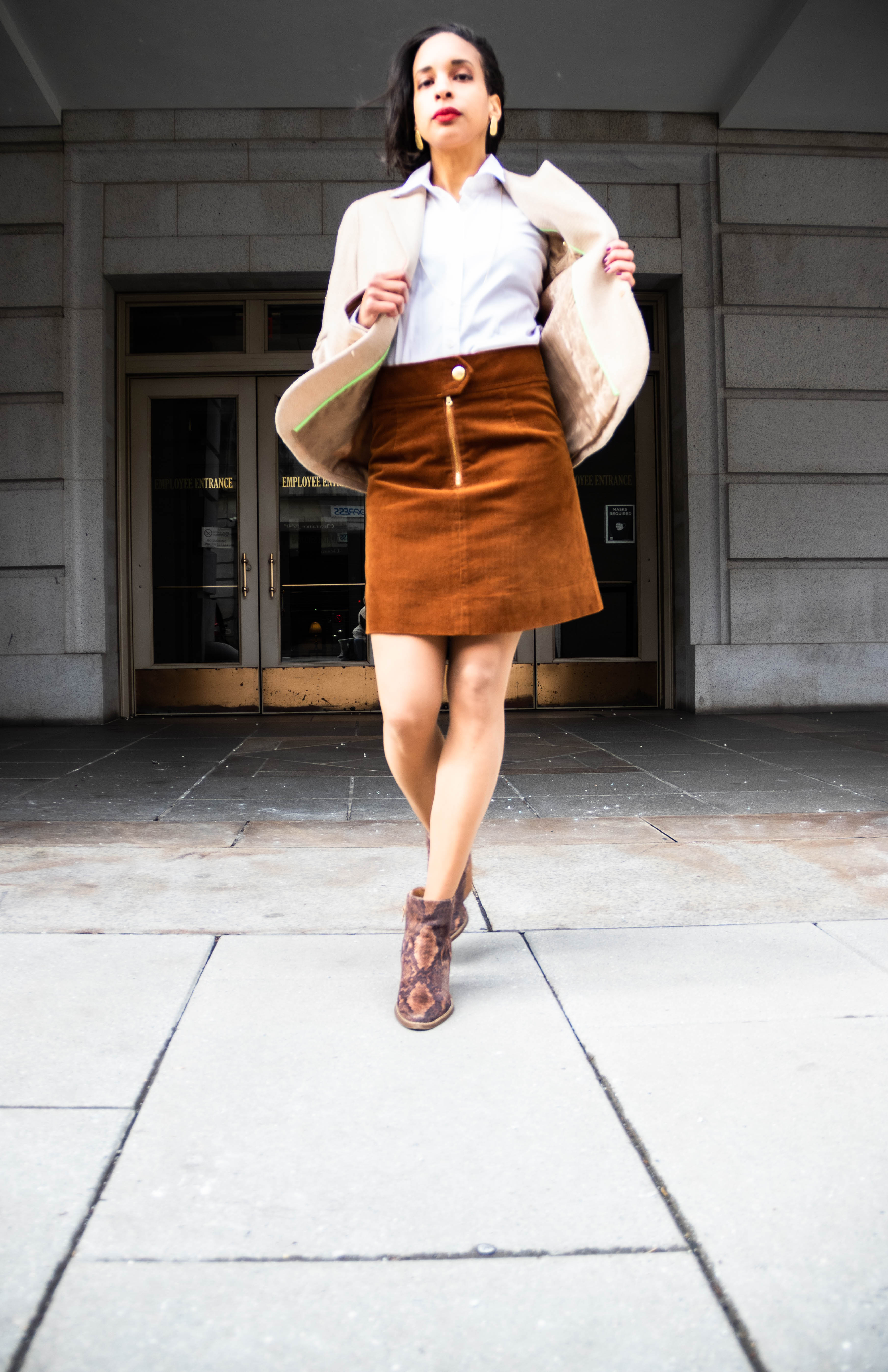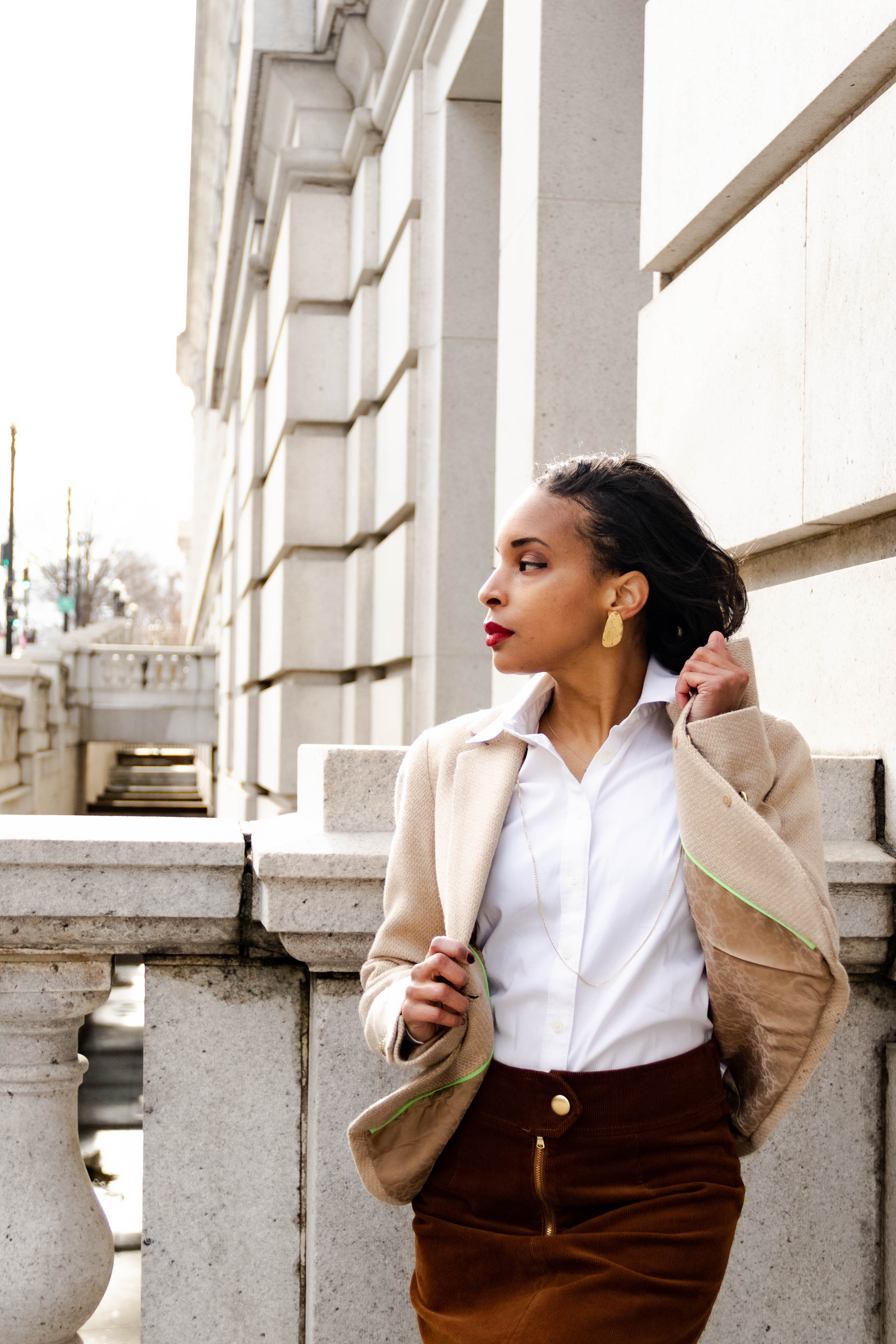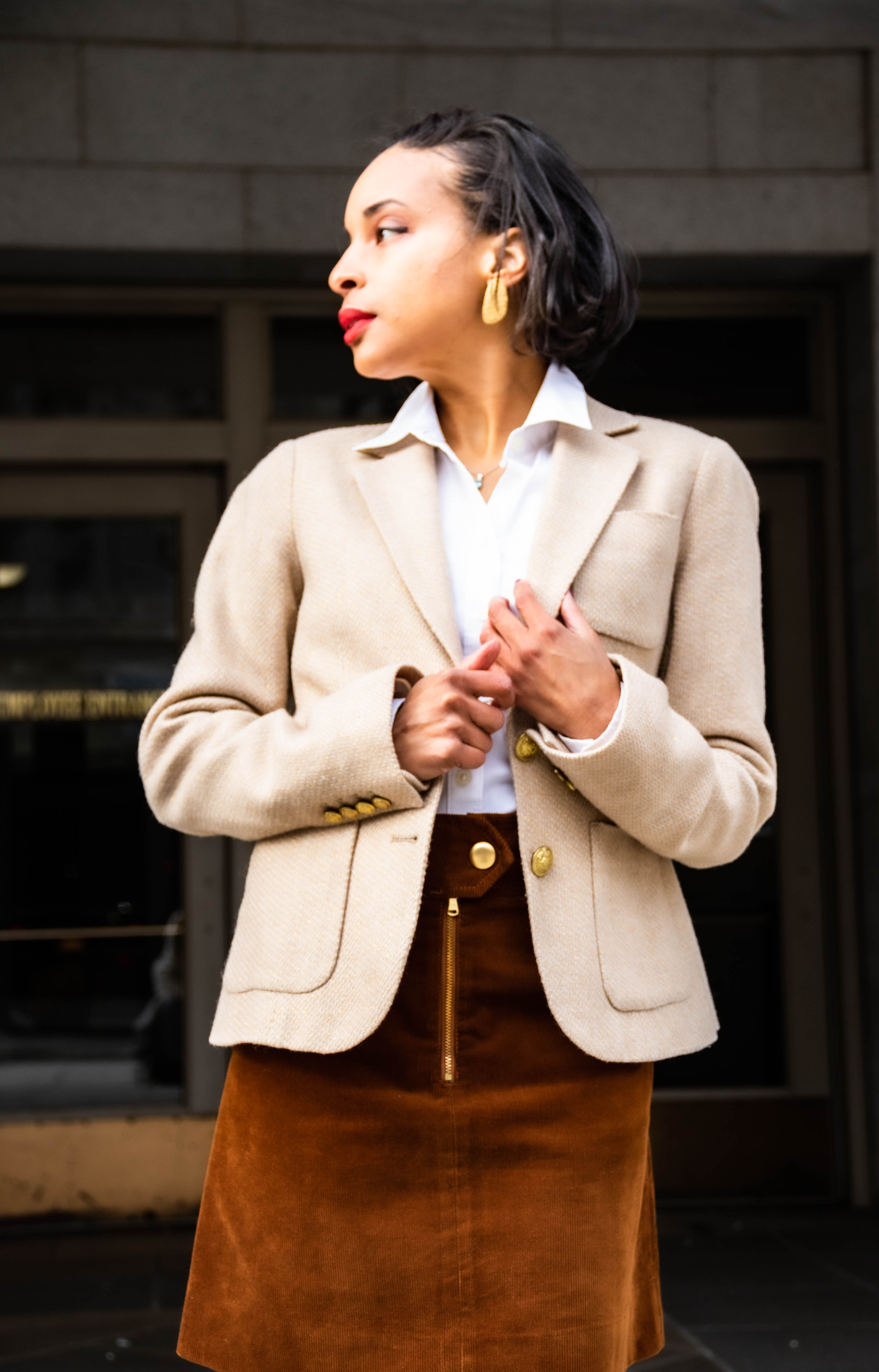 After working from home for the past two years, I can speak for everyone when I say that I’m not excited to go back to a boring dress code. There’s a way to be professional while wearing the clothes you feel comfortable wearing. First, make sure your attire is within the company’s dress code, then find a nice compromise between what’s appropriate and your personality. This single gold button beige C-Whonder blazer paired with a white button-down blouse and a chocolate corduroy skirt was my go-to because it’s fun, girly, and in the company’s dress code.