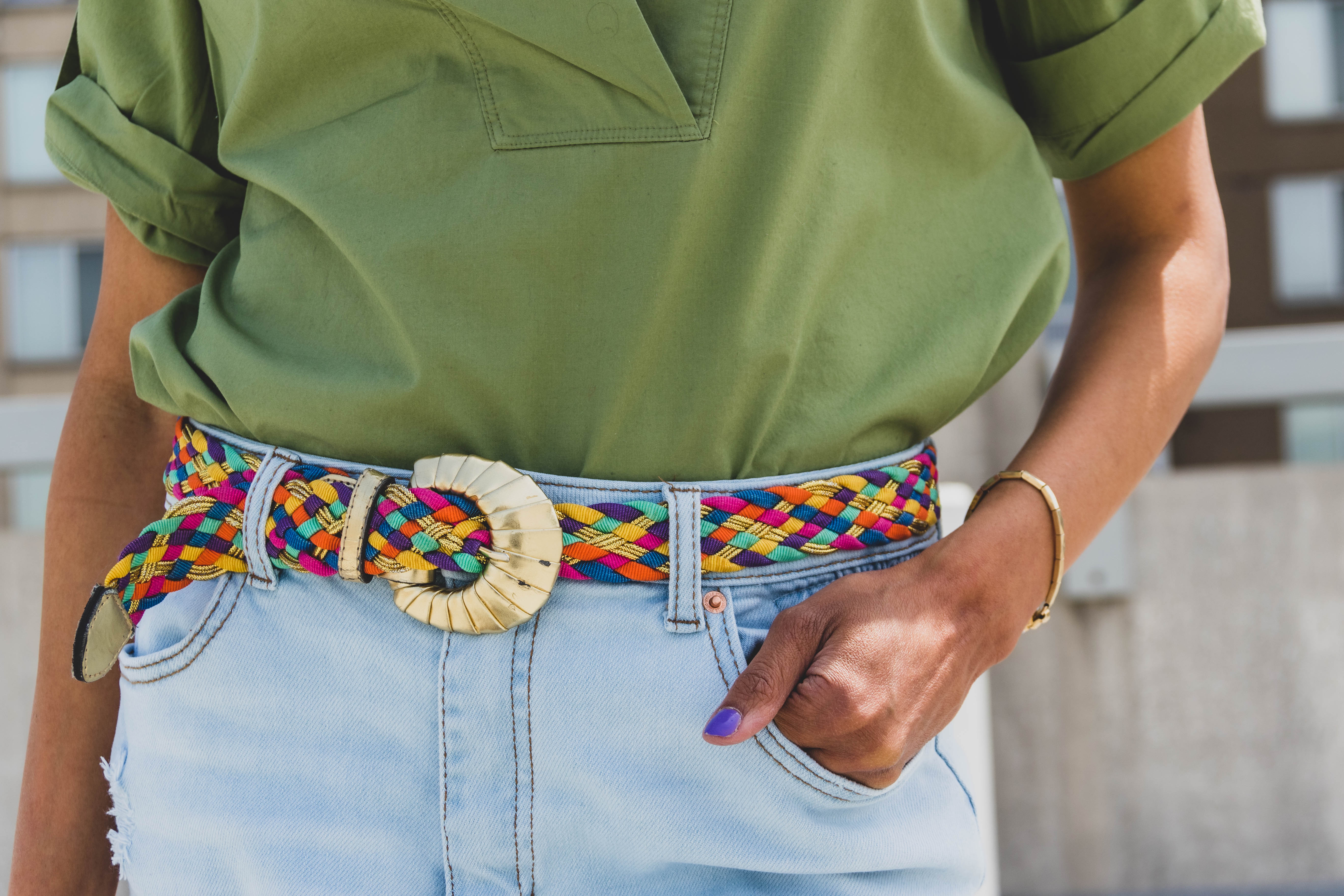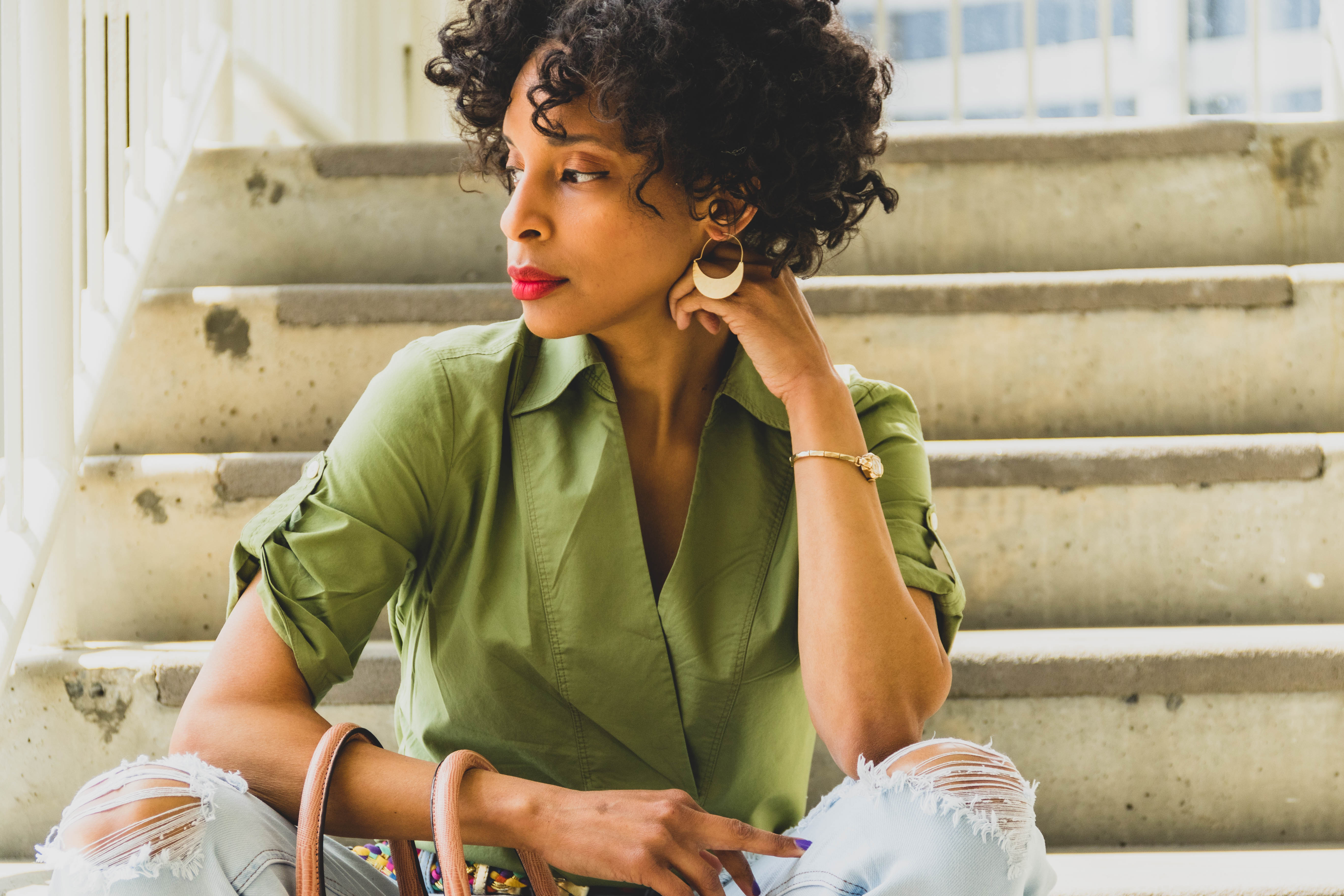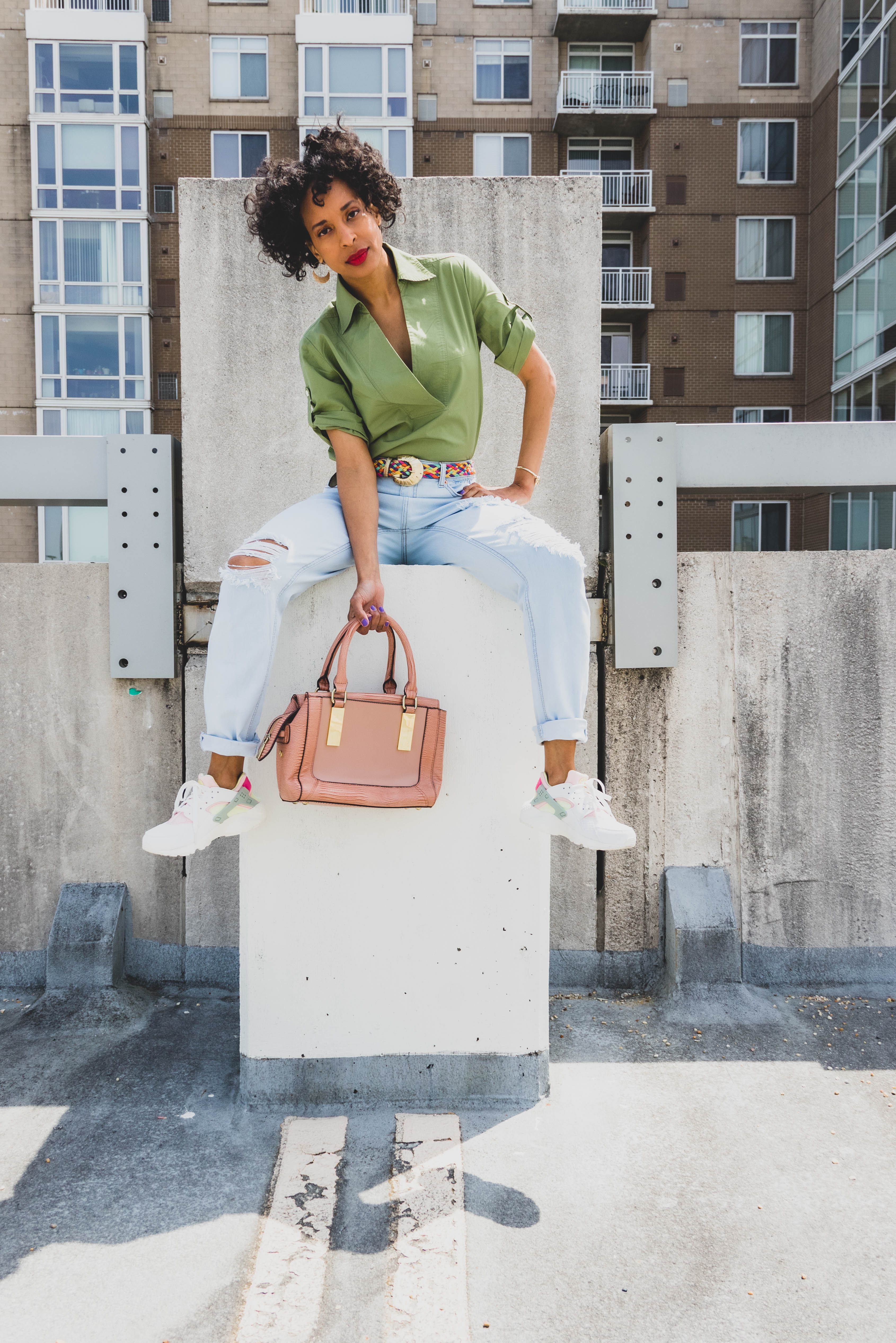 You don’t always need to wear a dress or heels to look chic; sometimes, you can accomplish this look with jeans and tennis shoes. I attended an outdoor event and opted out of a skirt and heels to wear high-waisted distress jeans with a stretch green-collar blouse, multi-color belt, and Hurachi tennis shoes. I was not only cute, but COMFORTABLE!